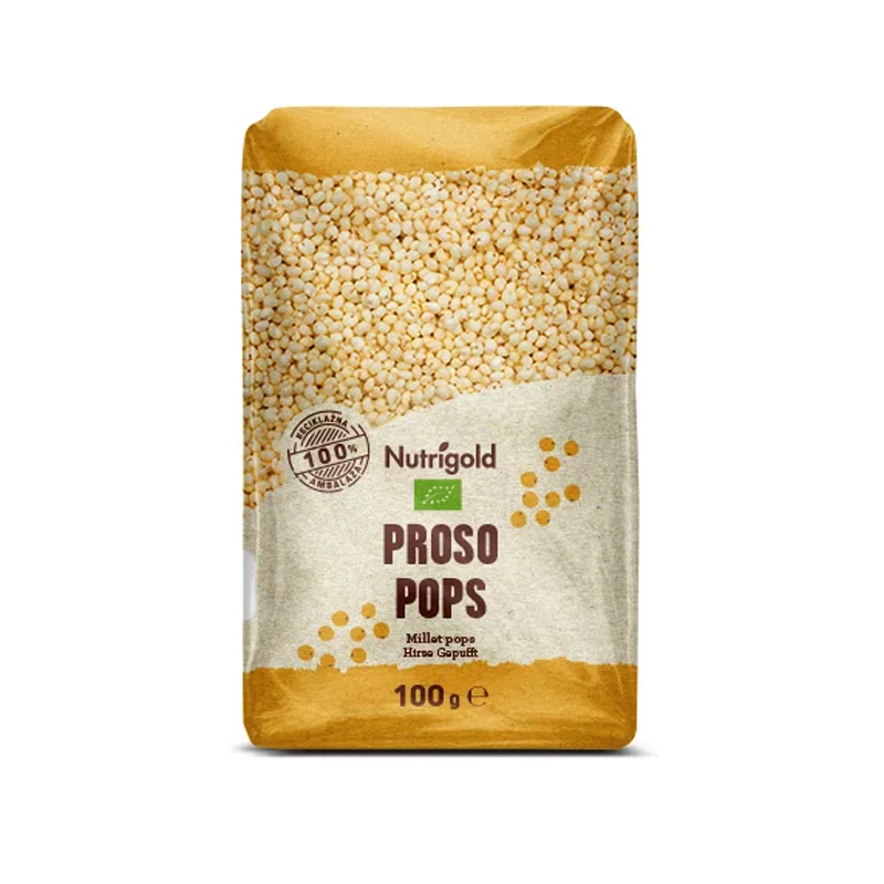 Nutrigold proso pops je 100% organski ekspandirani proso iz ekološkog uzgoja. Savršeno pahuljast, lagan proizvod izvornog sastava jer ne sadrži dodane šećere i soli. Zbog bogatog udjela ugljenih hidrata Nutrigold proso pops je idealna opcija zdravog doručka koji će vas ispuniti pozamašnom količinom energije.