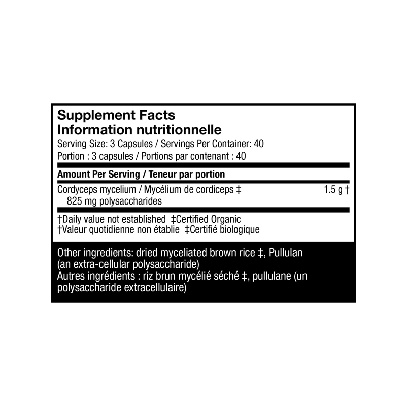 Host Defense Cordiceps koristi aktivirani, optimalno osušeni, sertifikovani organski micelijum pečuraka, sa punim spektrom sastojaka: >55% (825 mg/porcija) polisaharida i nizom ekstracelularnih sastojaka i drugih mikonutrijenata, neophodnih za podršku prirodnom imunitetu.